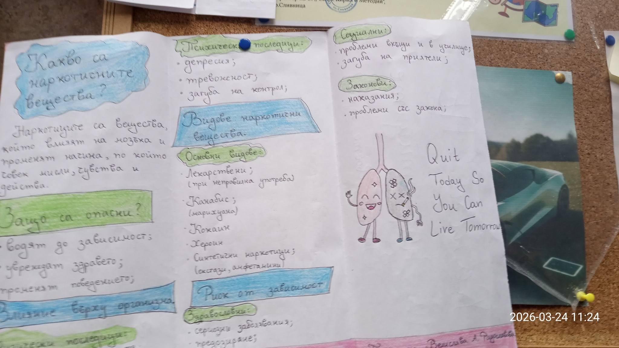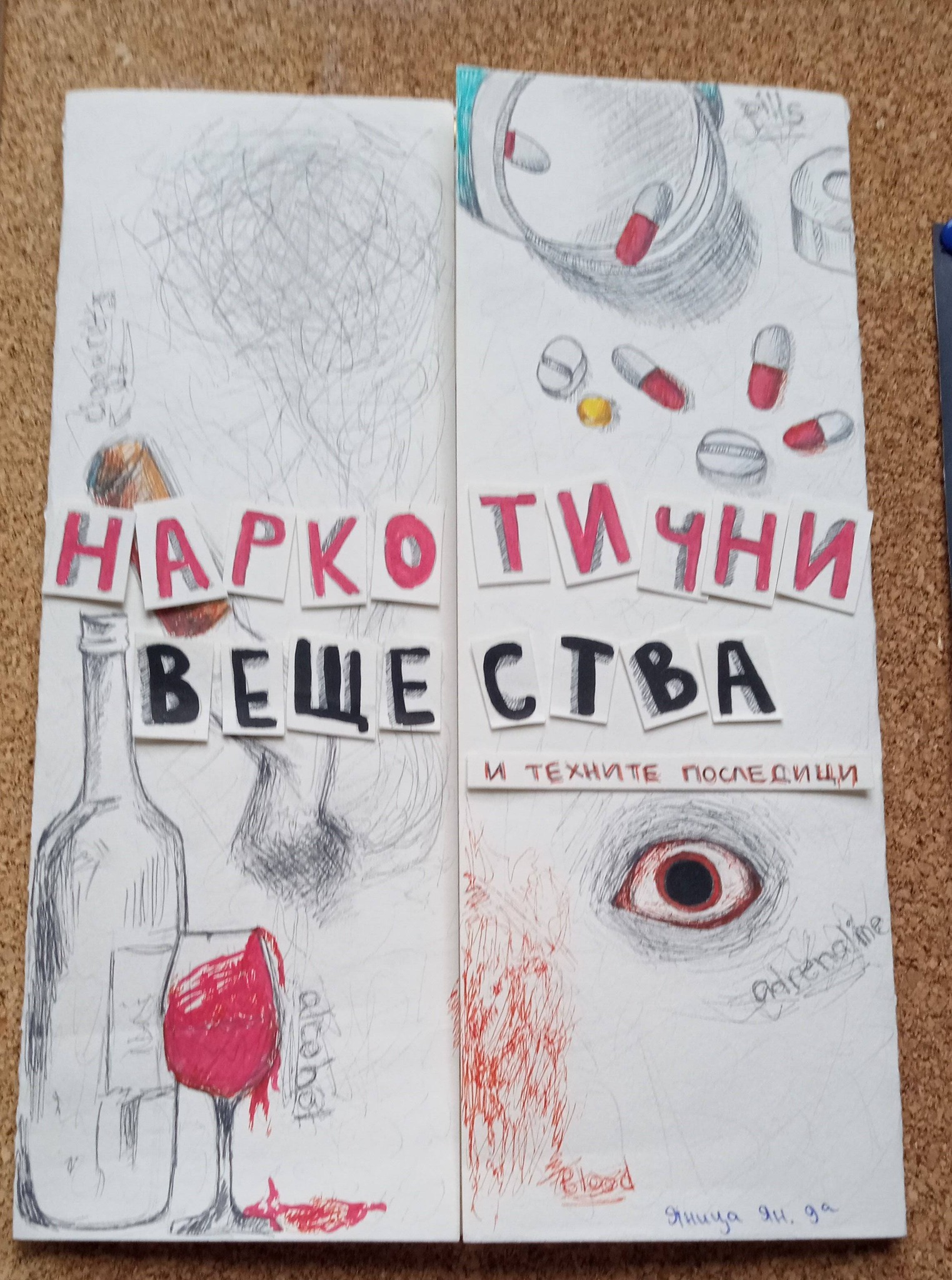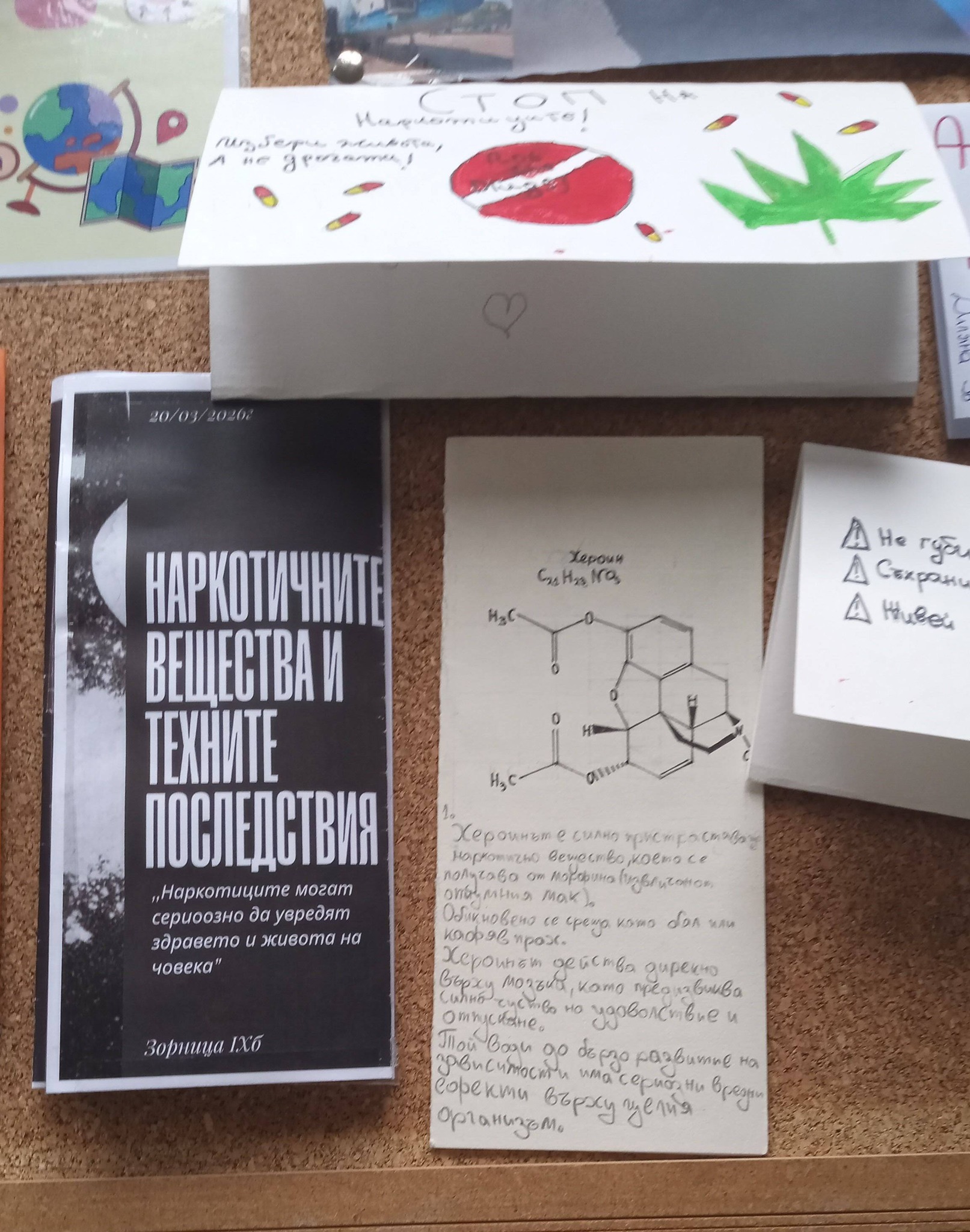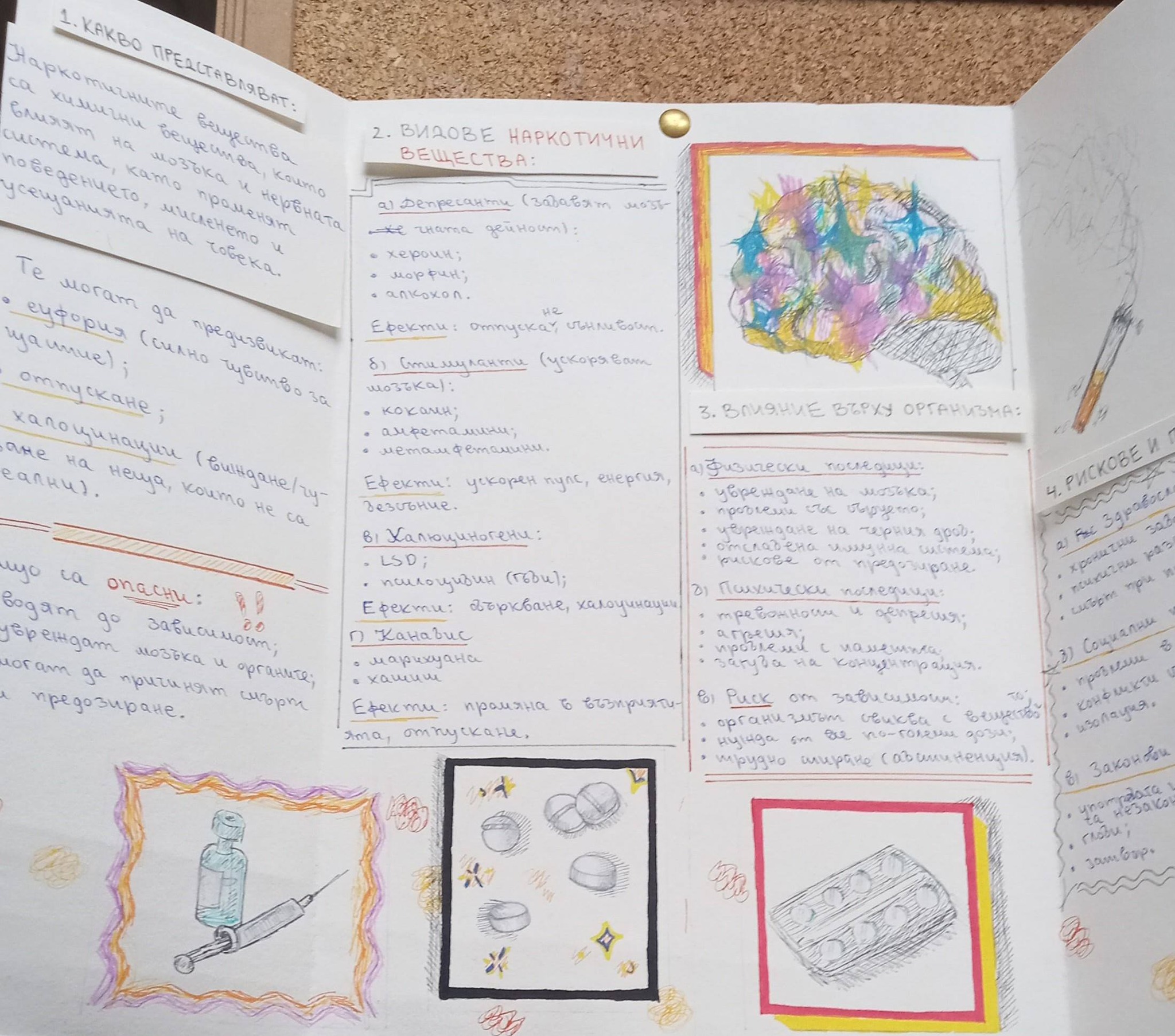 В брошурите учениците представят научно обоснована информация за различни видове наркотични вещества, тяхното въздействие върху човешкия организъм и рисковете от употребата им. Специално внимание е отделено на влиянието върху нервната система, развитието на зависимост и дългосрочните последици за физическото и психическото здраве.