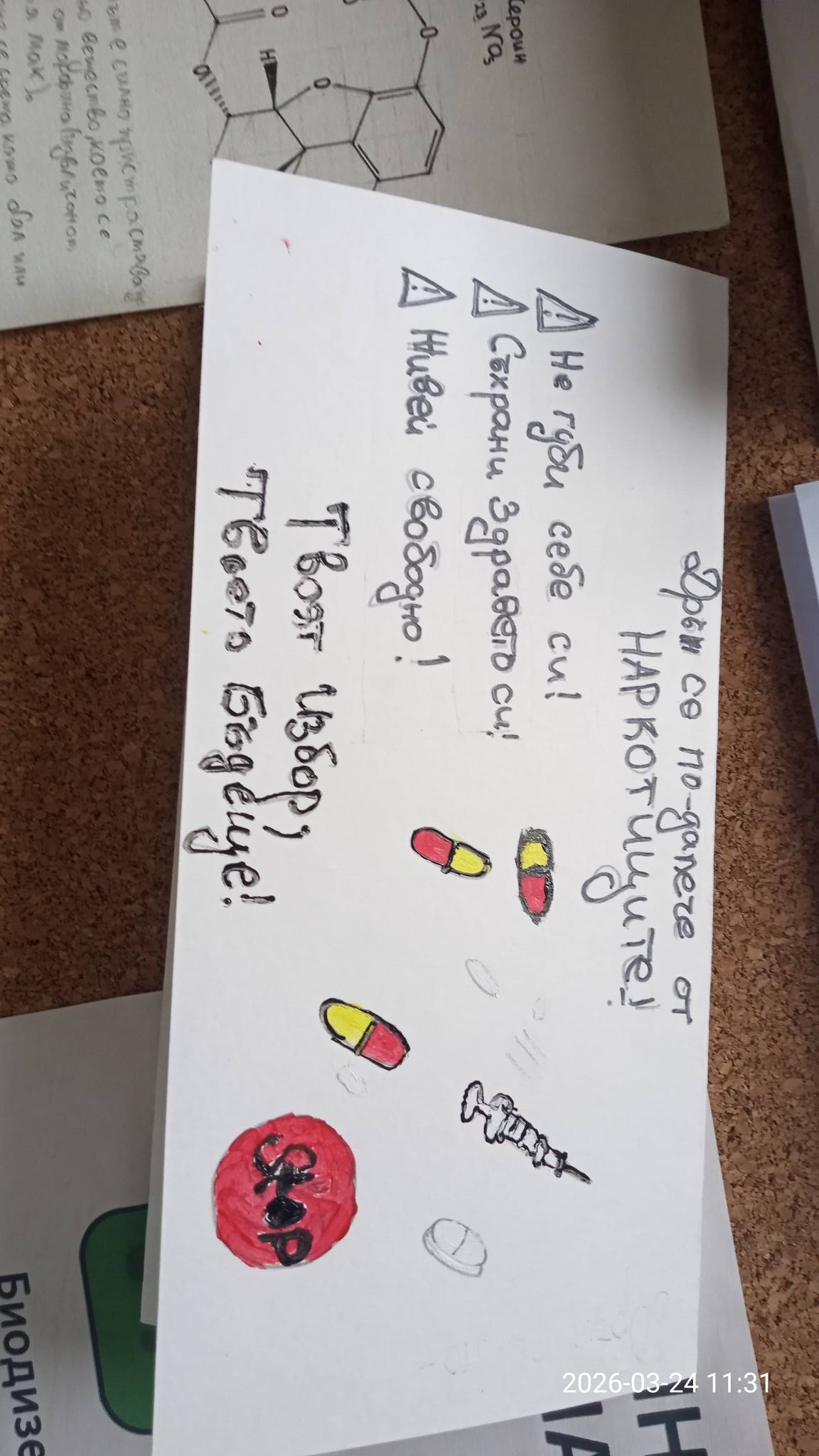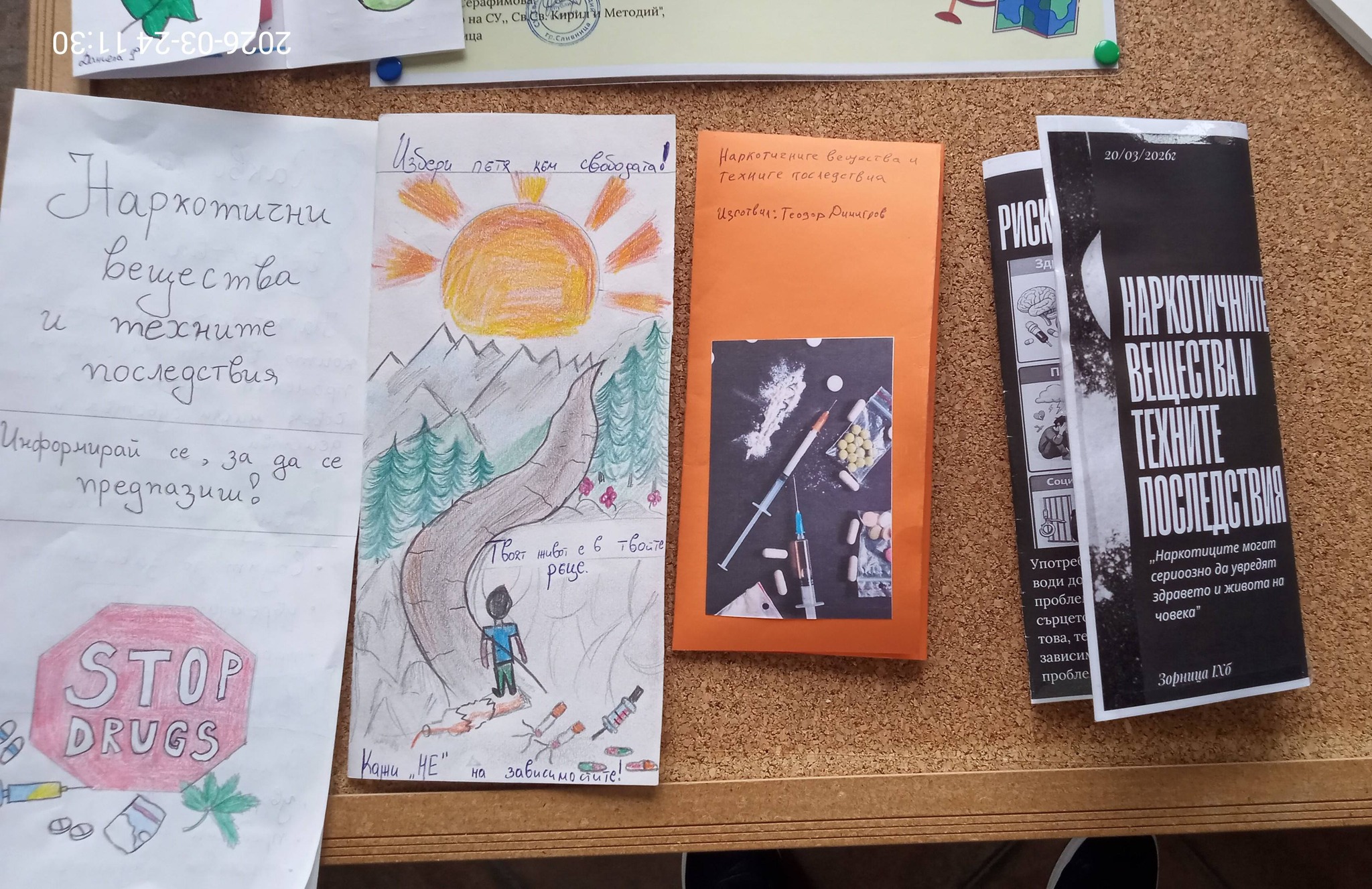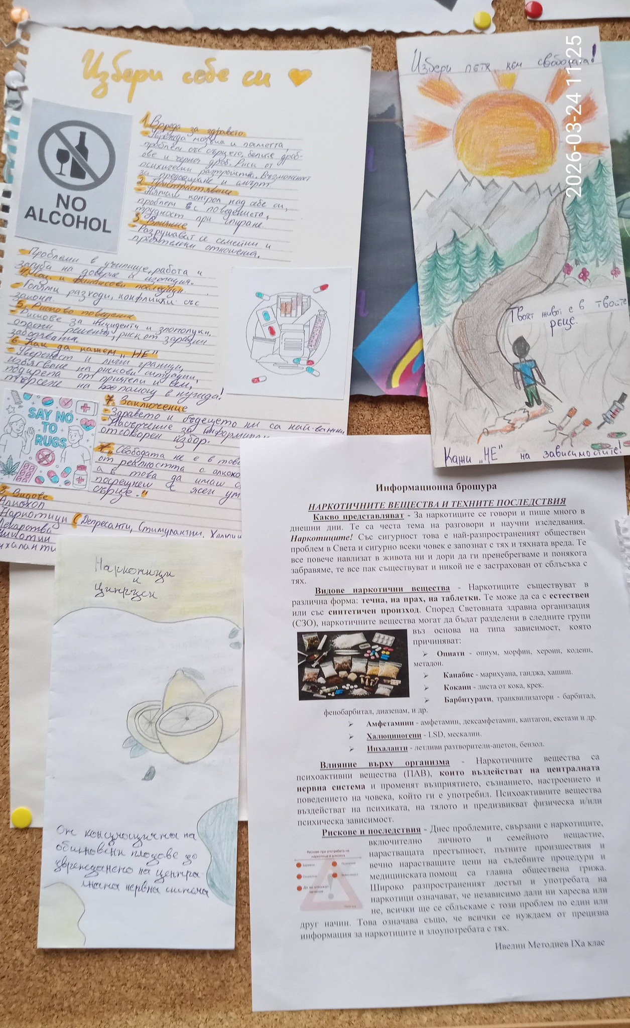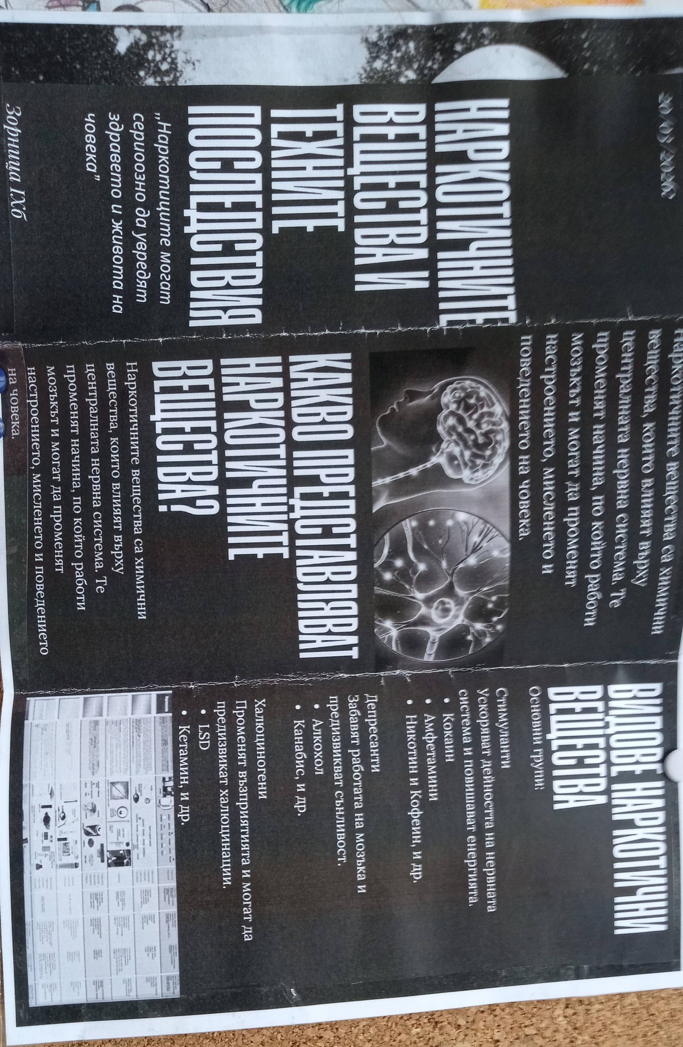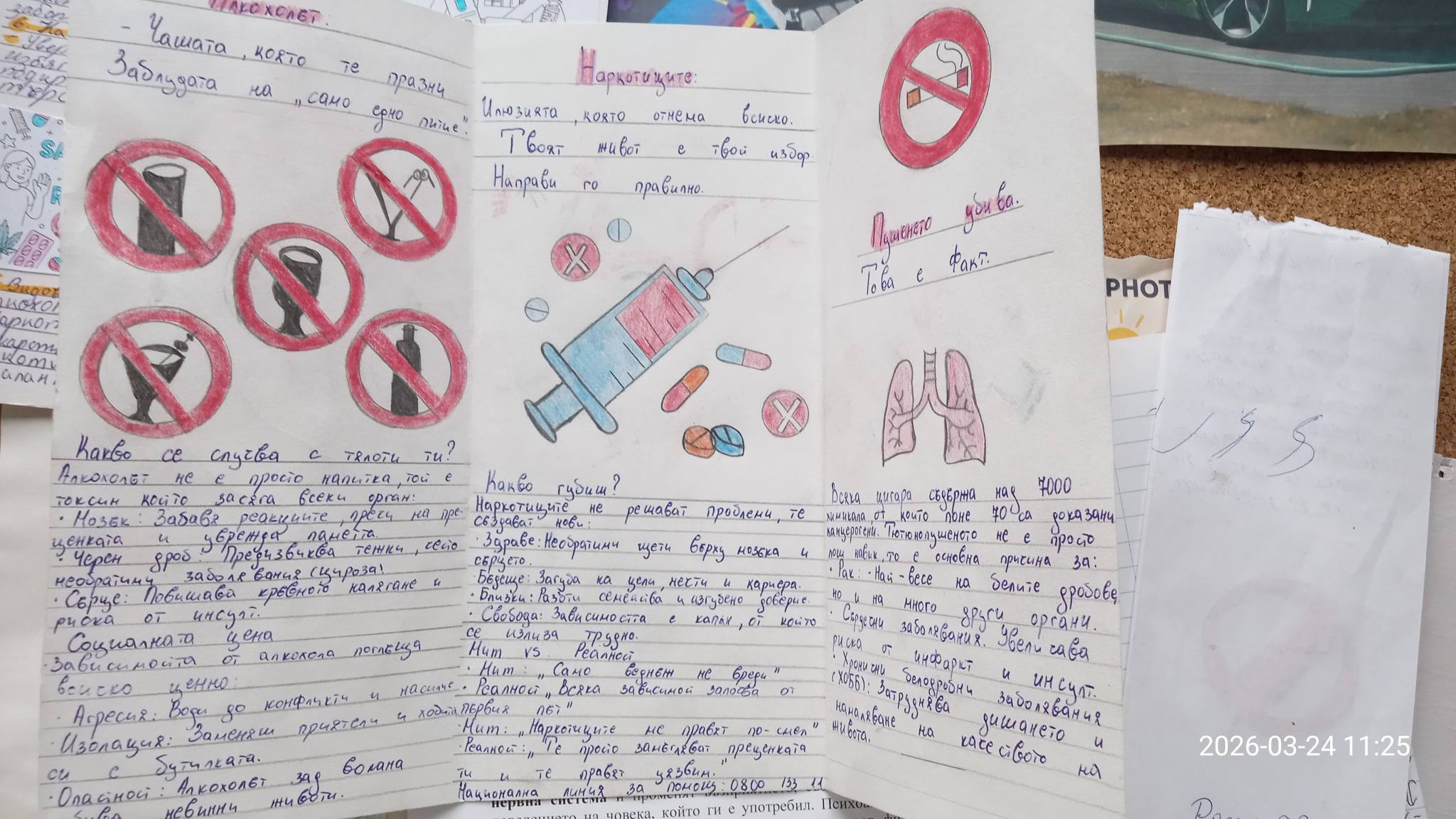 В брошурите учениците представят научно обоснована информация за различни видове наркотични вещества, тяхното въздействие върху човешкия организъм и рисковете от употребата им. Специално внимание е отделено на влиянието върху нервната система, развитието на зависимост и дългосрочните последици за физическото и психическото здраве.