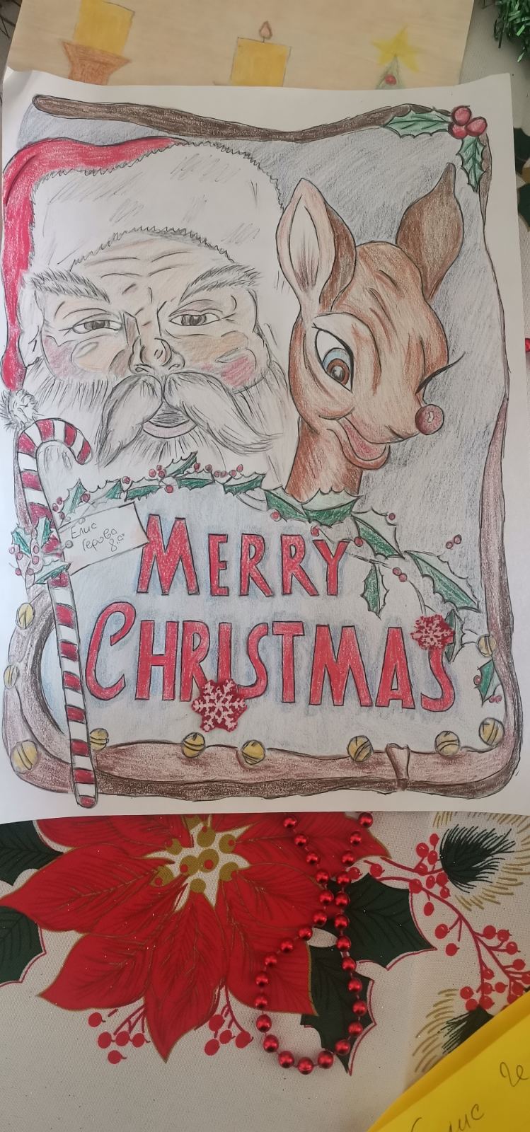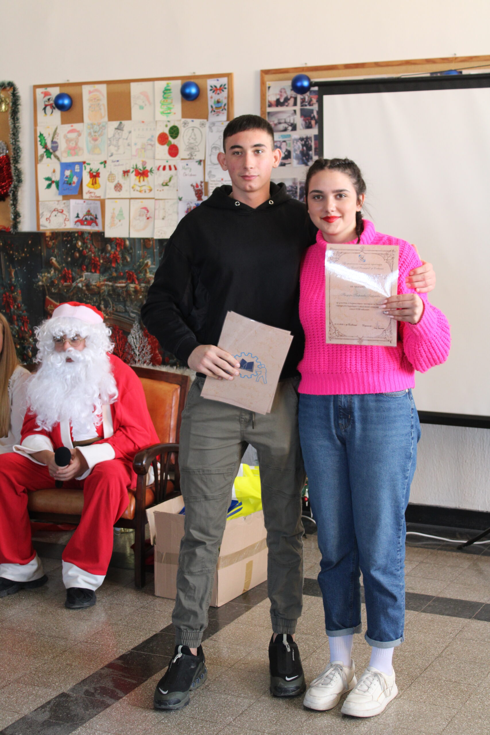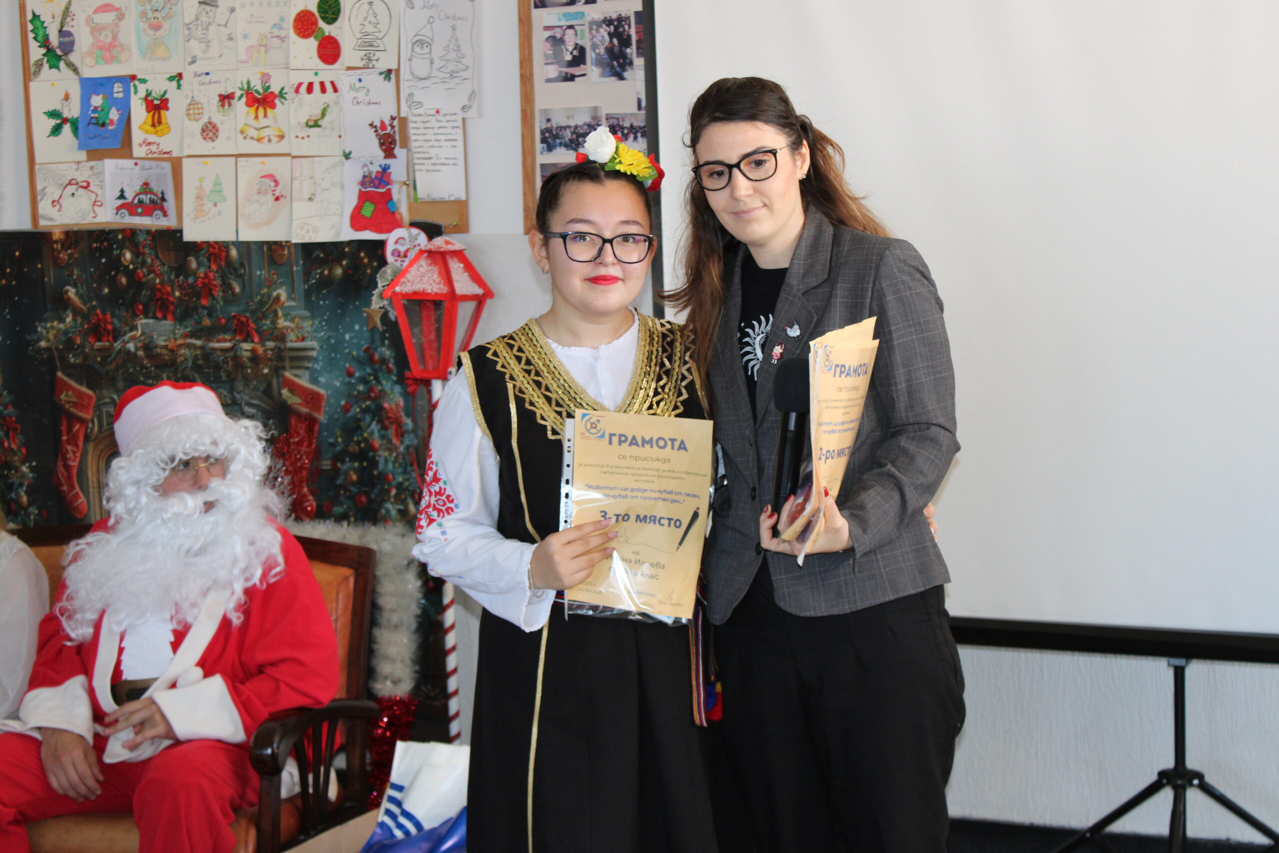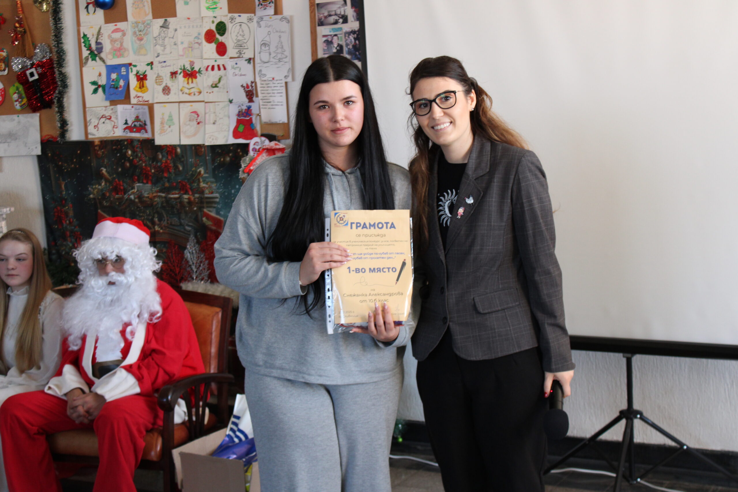 В рамките на коледното тържество бяха отличени и участниците в конкурса за коледна рисунка. Първо място завоюва Елис Герова от 8. А клас, второ място беше присъдено на Искрен Йорданов, а трето място – на Алекс Петров. Радина Томова получи специална грамота като най-малък участник в конкурса, а Йоанна Томанова беше отбелязана за своето активно участие. Отличията са признание за таланта, въображението и творческия дух на учениците, които допринесоха за празничната атмосфера на събитието.