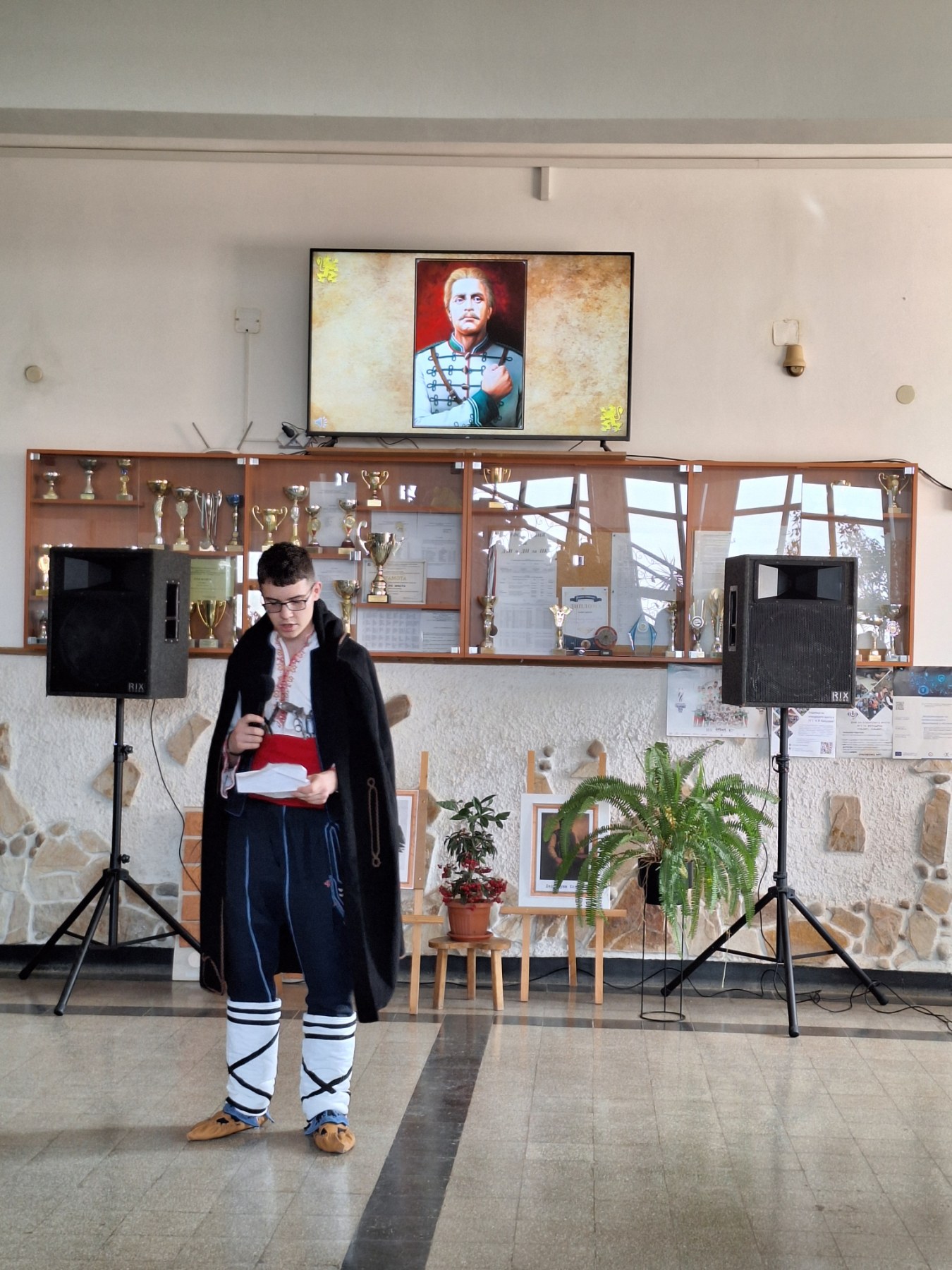С рецитал, проведен във фоайето на училището, учениците от десетите класове под ръководството на госпожа Ванеса Ангелова, представиха факти от живота и мисията на Левски, обезсмъртени в песните на поетите.