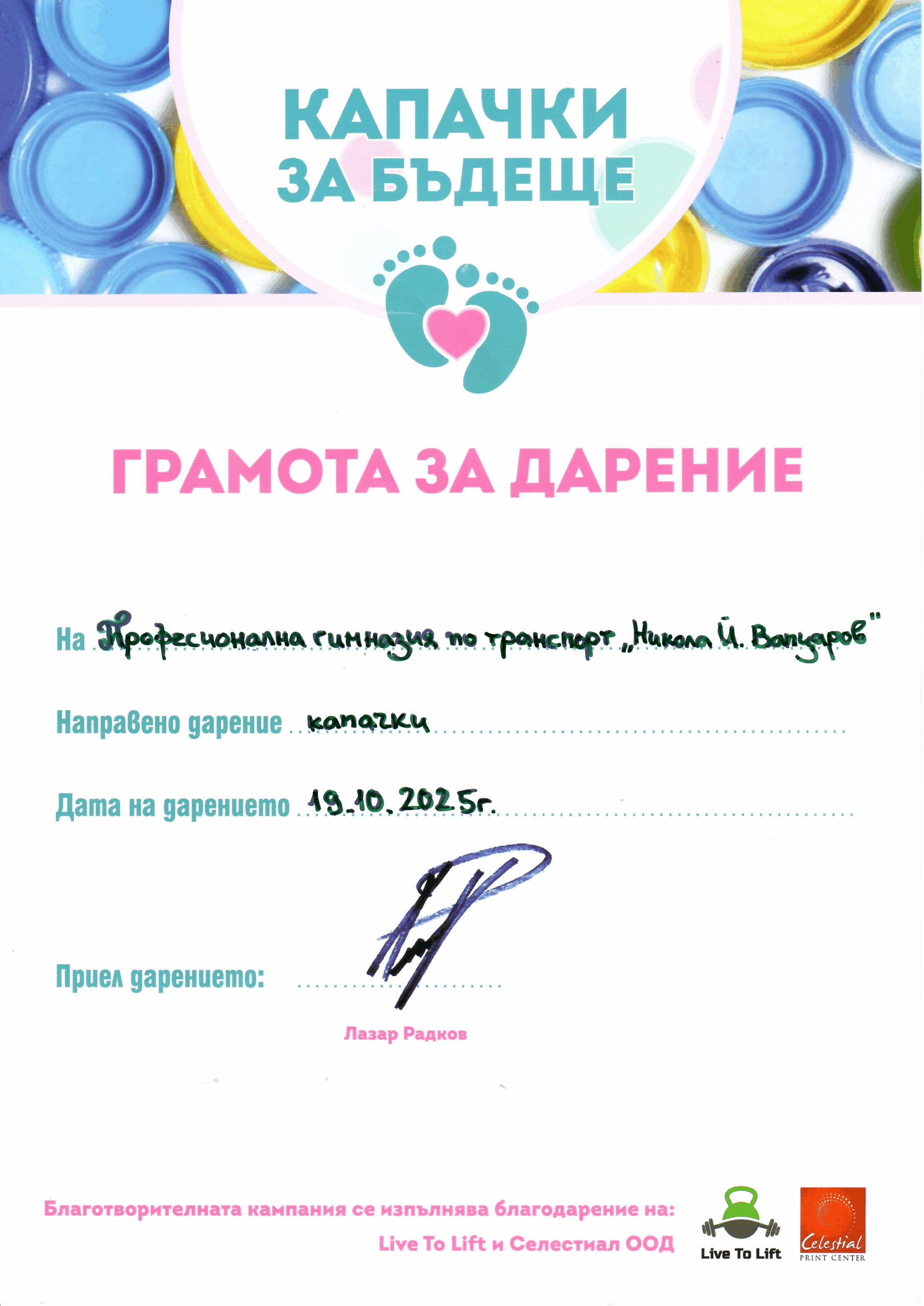 На 17 октомври (петък) учениците Габриела от 8. „А“ клас и Петя от 9. „Б“ клас от Професионалната гимназия по транспорт „Н. Й. Вапцаров“ – гр. Сливница взеха активно участие в благотворителната инициатива „Капачки за бъдеще“. Те се включиха в събирането и прехвърлянето на събраните пластмасови капачки от училищното „сърце“ в чували, които бяха предадени в София за каузата.