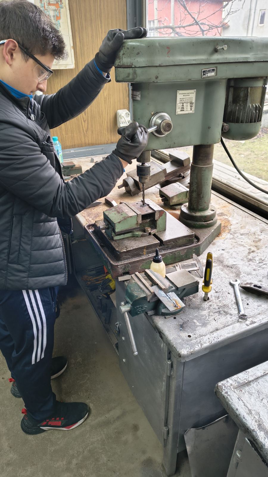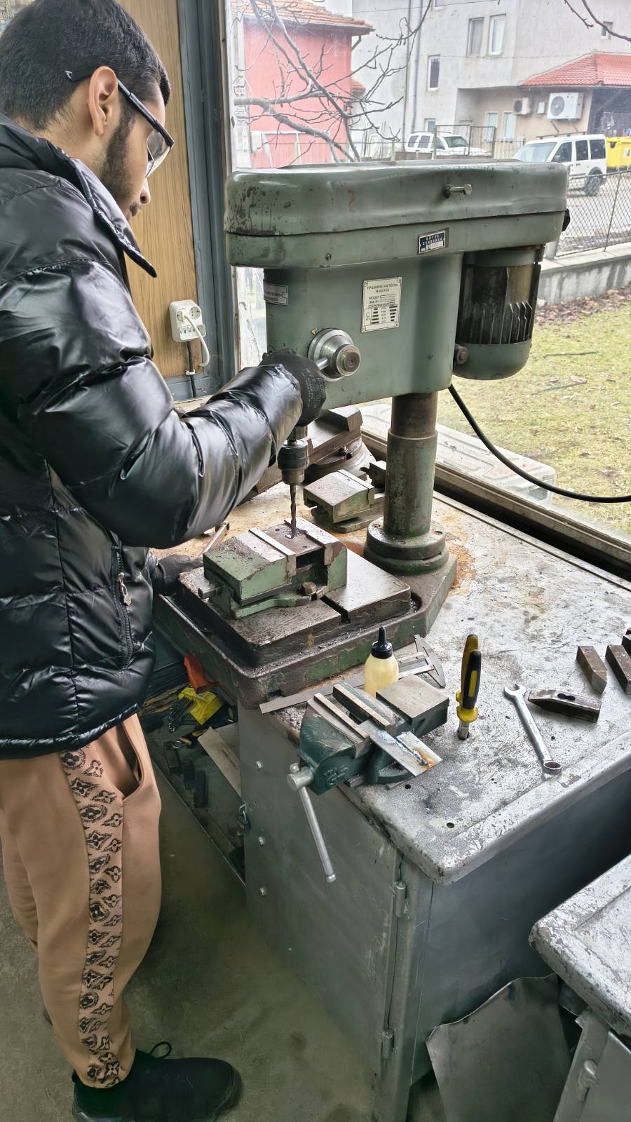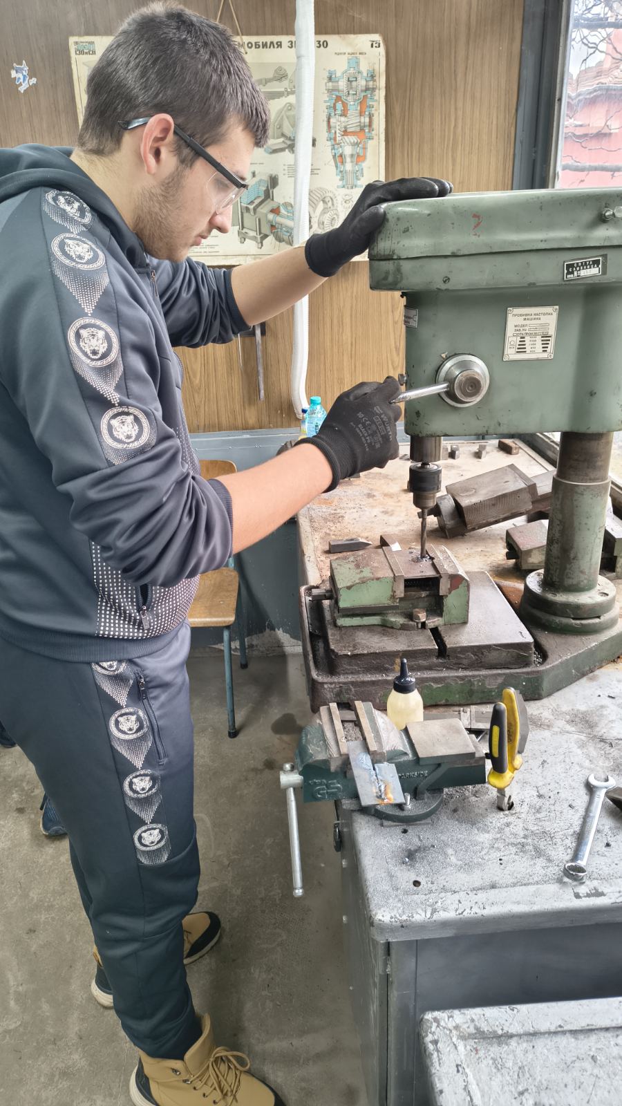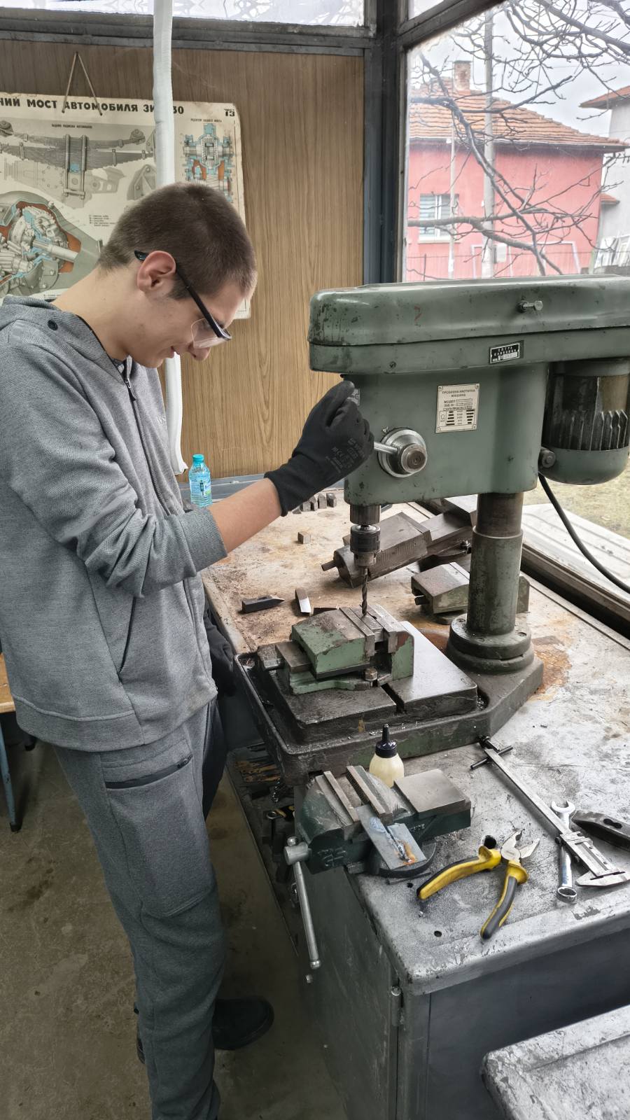 В часа по практика учениците от 9.б клас проведоха учебно занятие на тема „Технологии при пробиване, зенкероване и райбероване“ под ръководството на г-н Младен Младенов.