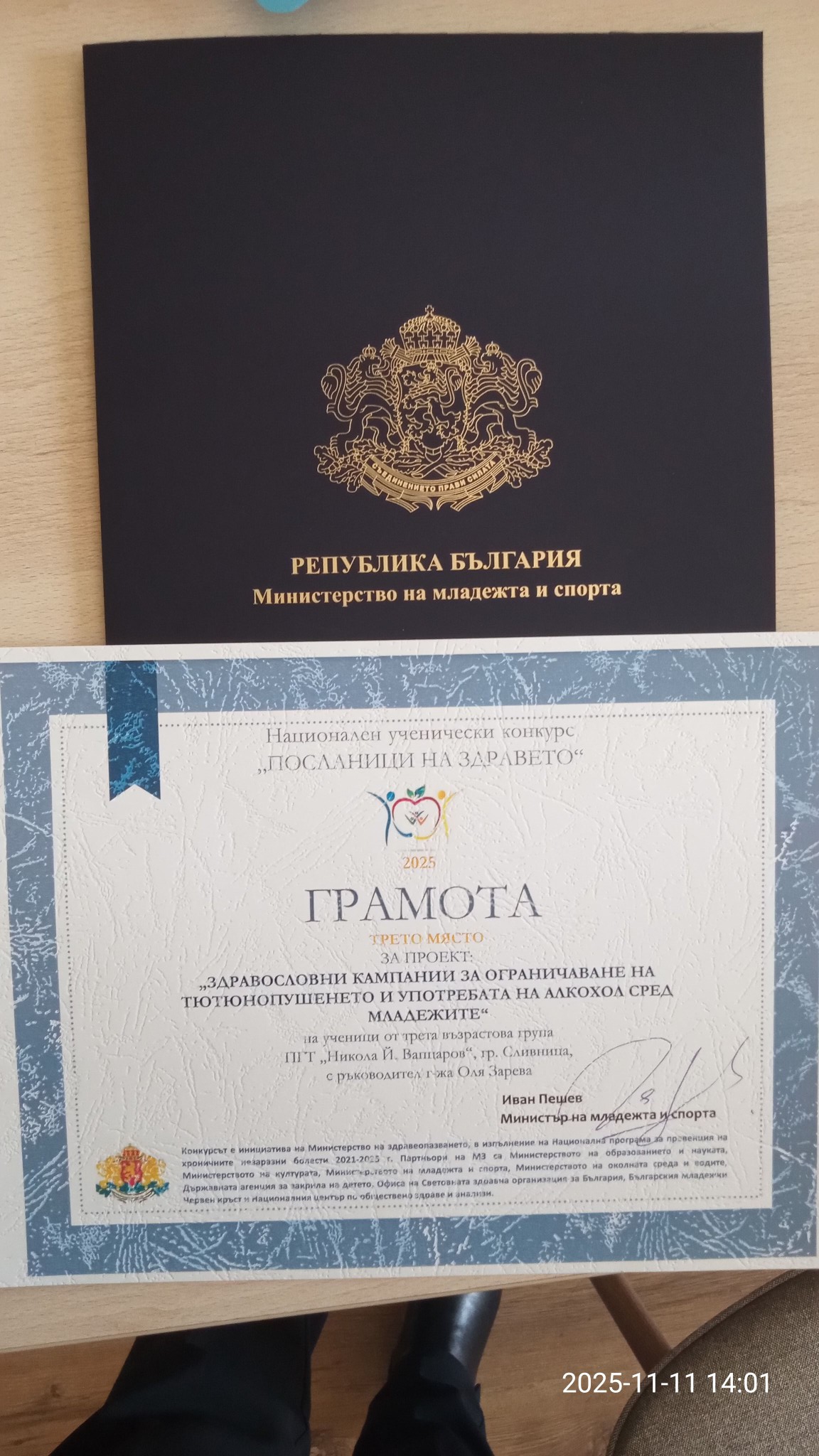 Те бяха класирани в XVII издание на Националния ученически конкурс „Посланици на здравето“ от 75 проекта на ученици от I до XII клас от цялата страна. Инициативата е на Министерството на здравеопазването в партньорство с Министерството на образованието и науката, Министерството на културата, Министерството на младежта и спорта, Министерството на околната среда и водите, Държавната агенция за закрила на детето, Офиса на Световната здравна организация за България, Българския младежки Червен кръст и Националния център по обществено здраве и анализи..