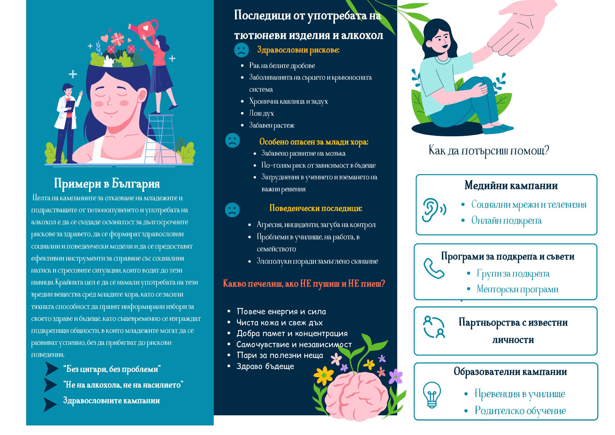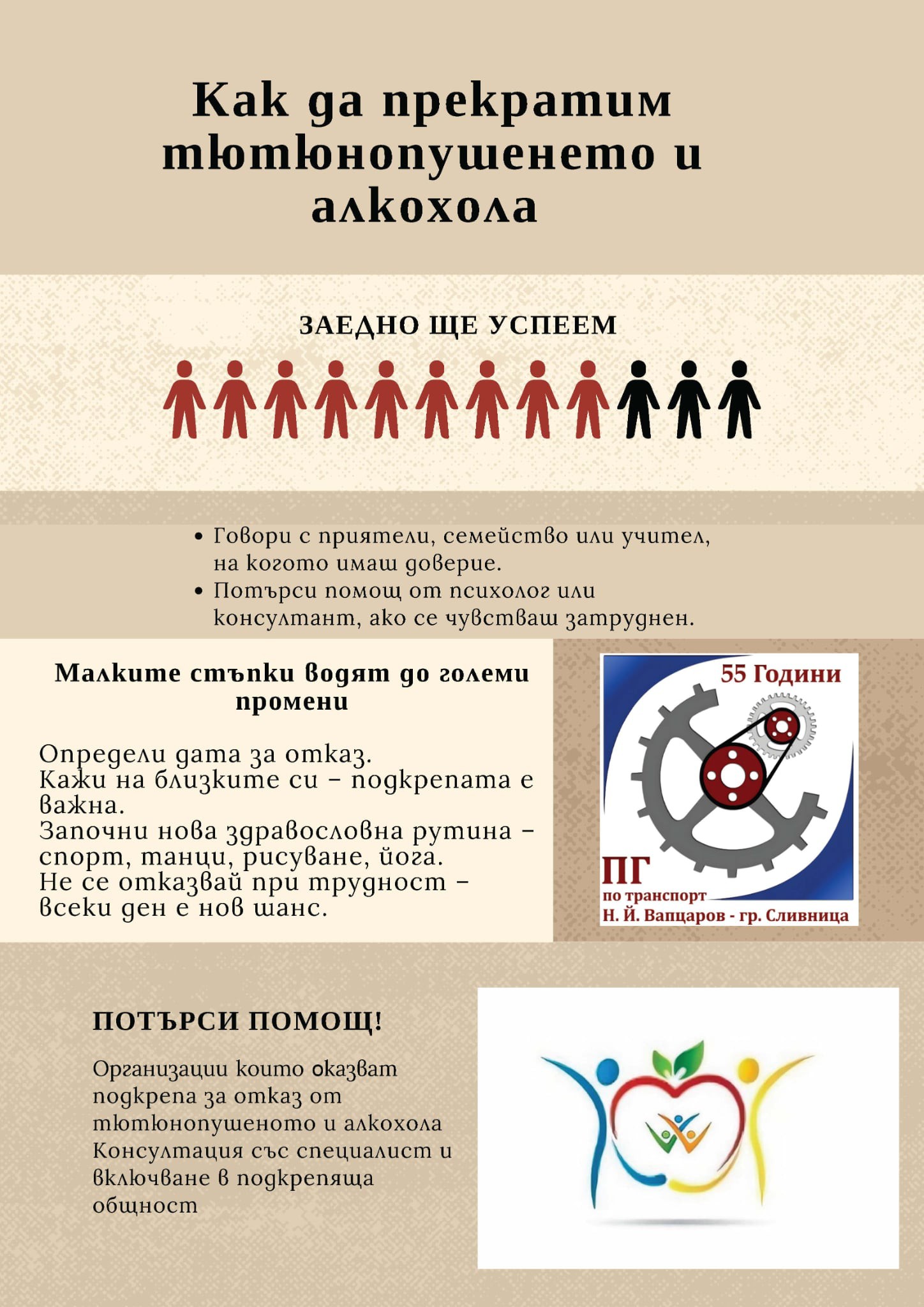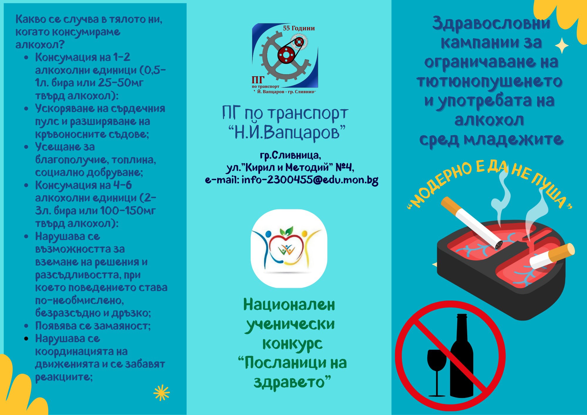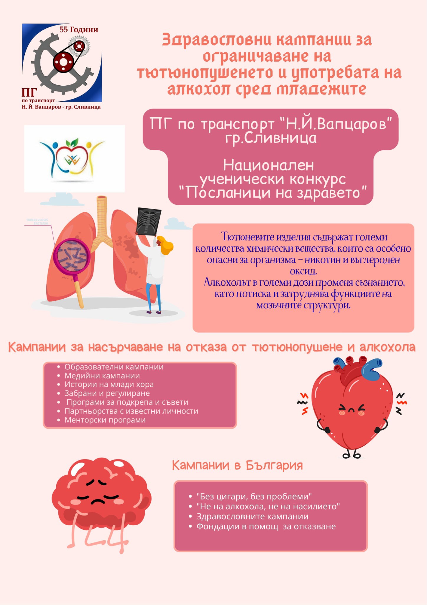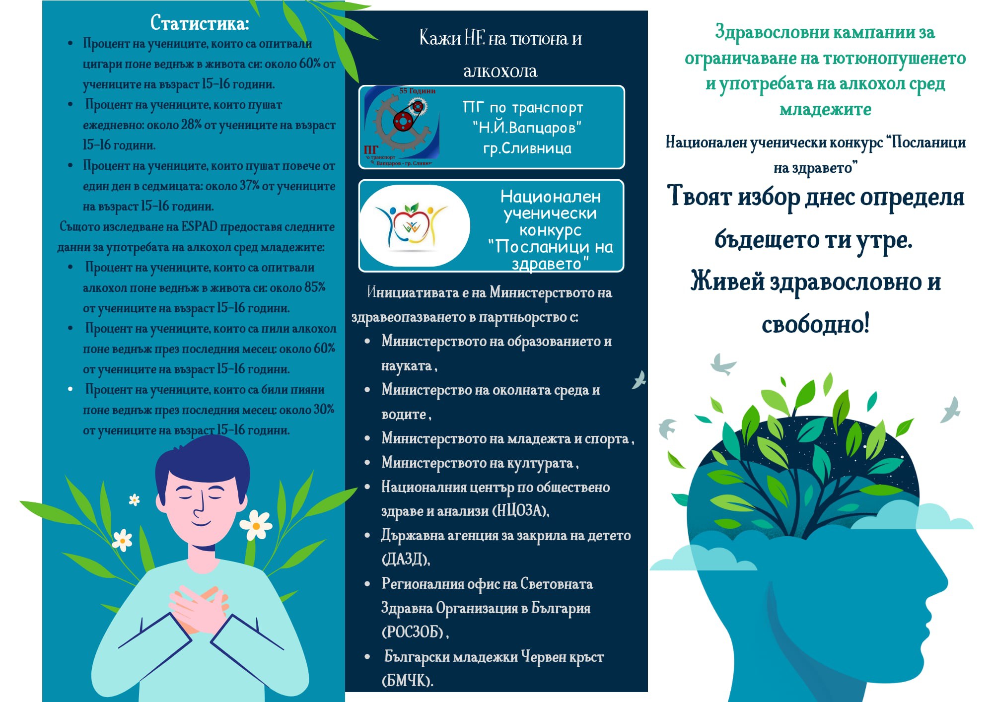 Под ръководството на своя преподавател Катя Димитрова екипът на 11 А клас реализира проекта „Здравни кампании за отказ от тютюнопушене и алкохол“ насочен към популяризиране на здравословния начин на живот, физическата активност,положителните навици сред своите връстници и как да потърсят помощ.